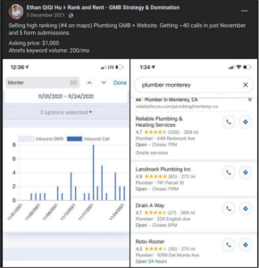 - In addition to selling these fake listings to GMBEye’s clients, Defendants sell them to other parties by other means. For example, Mr. Hu posted the below offer to sell a Business Listing in a Facebook group called “Rank and Rent – GMB Strategy & Domination,” claiming that his listing for a “Plumbing GMB + Website” in Monterey, California, had received “~40 calls and 5 form submissions” in the prior month—presumably from residents of the Monterey area who were seeking assistance with a plumbing issue.